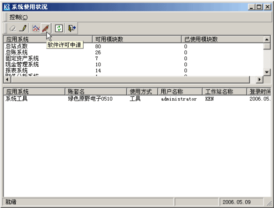 中间层服务部件安装完成后,通过中间层服务器“账套管理”—>“系统使用状况”—>“软件许可申请”管理软加密许可文件: